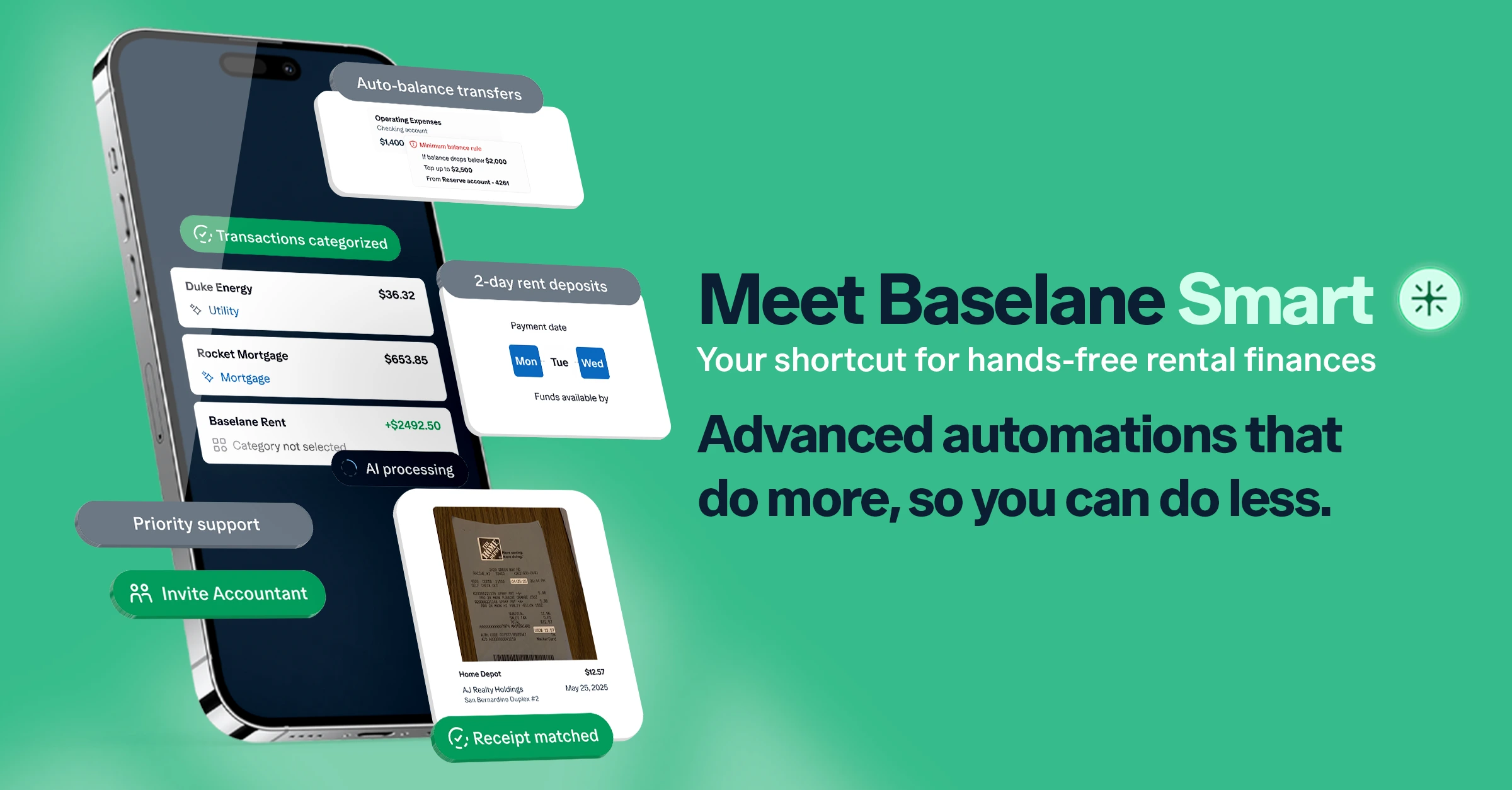More properties shouldn’t mean more admin. That’s why we launched Baselane Smart — a premium automation suite designed to streamline your rental financial operations.
