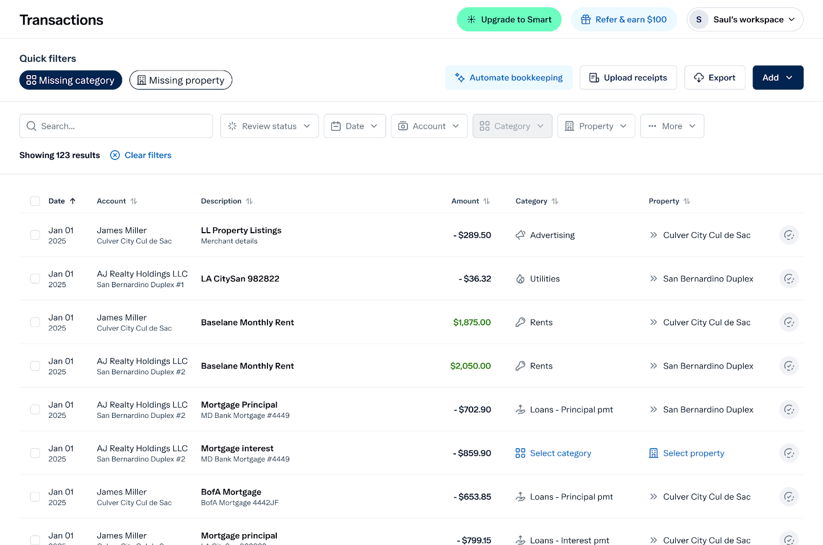 - Automated bookkeeping: Sync and categorize all your transactions (internal or external accounts) per property and 120+ Schedule E categories.