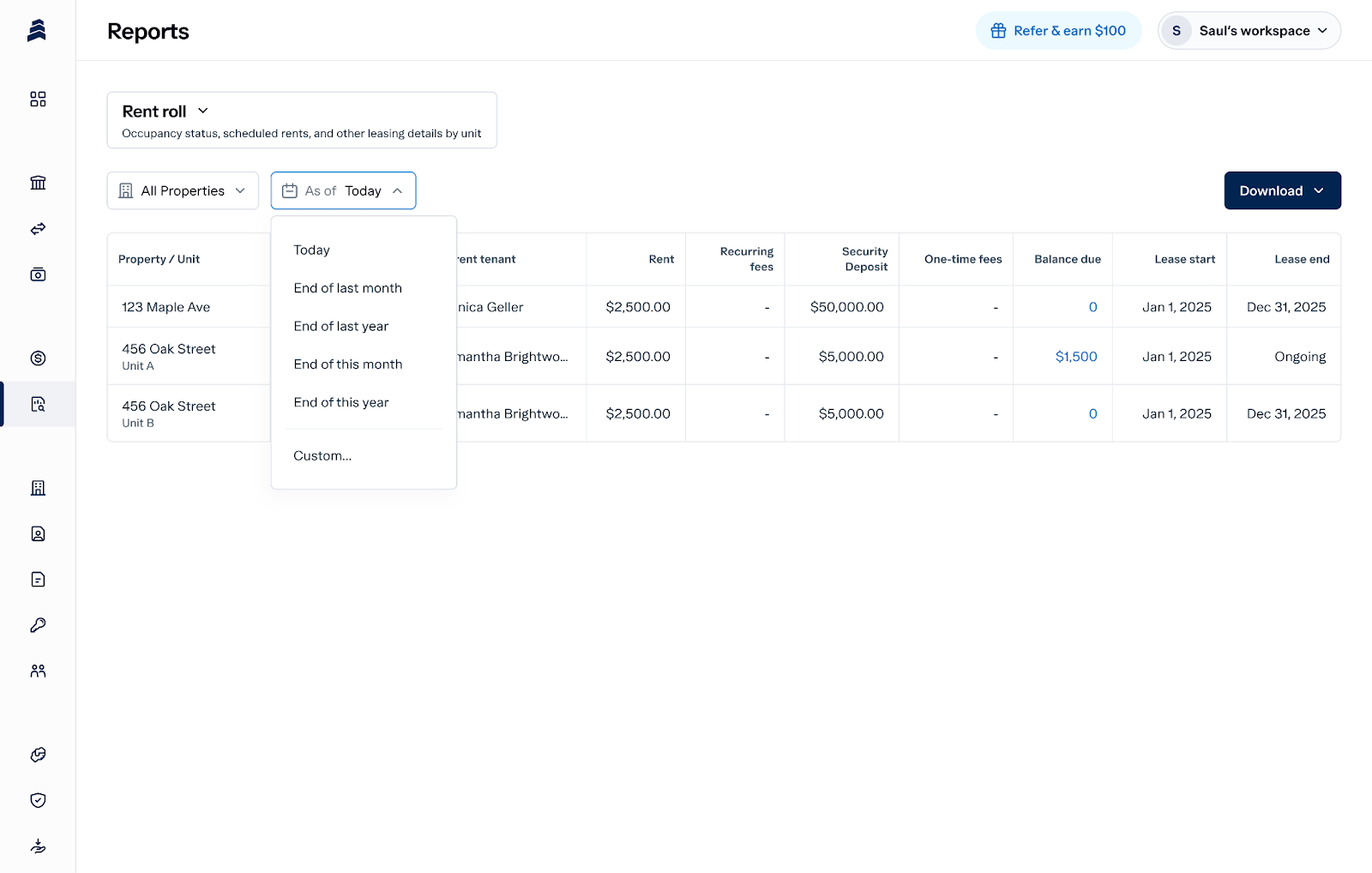 - Auto-generate tracking reports, including rent roll, rent ledger, and cash flow statement