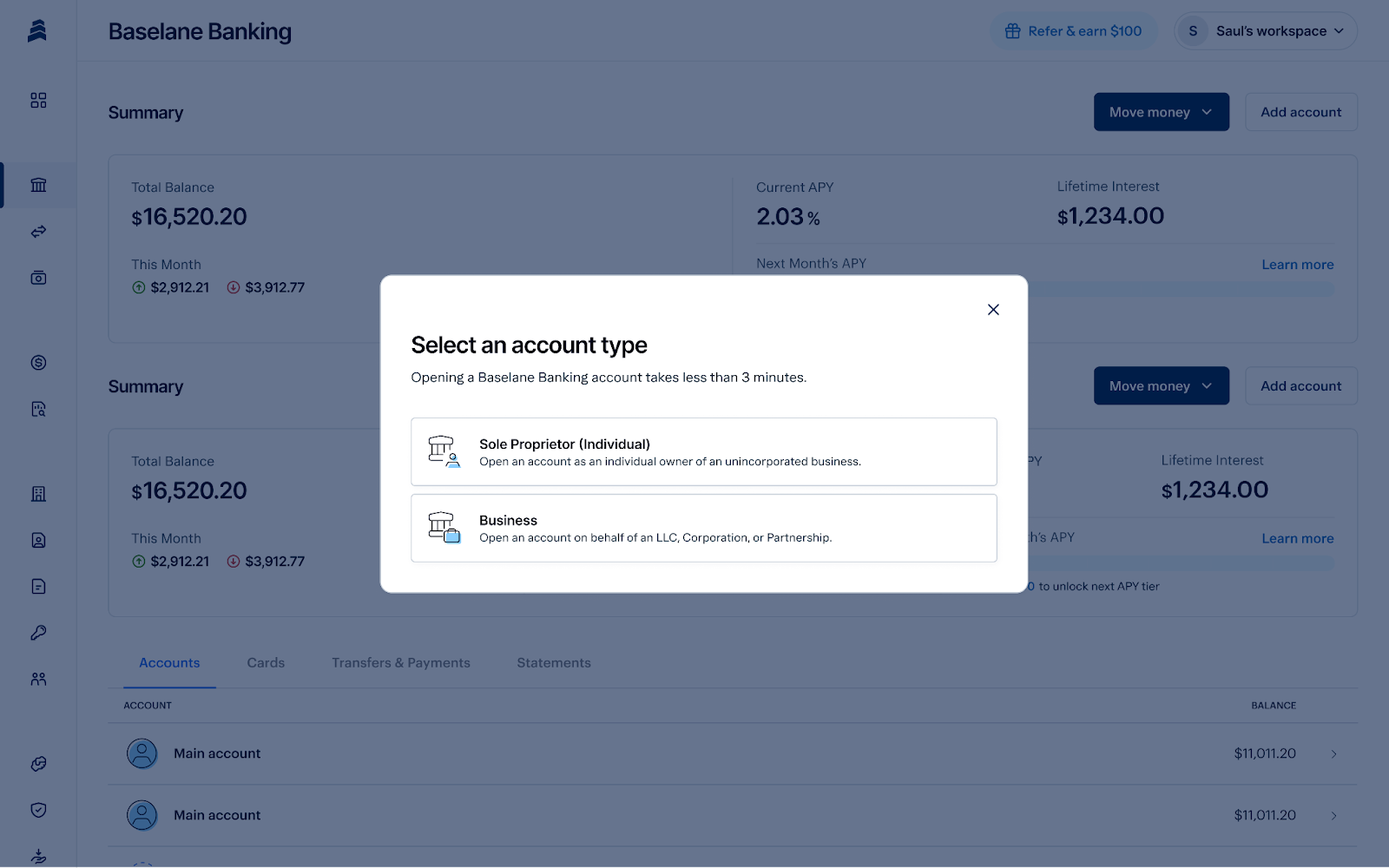To open a Baselane business checking account, you first create a free Baselane account, then add a business banking account. It takes no longer than a few minutes online to complete the application.