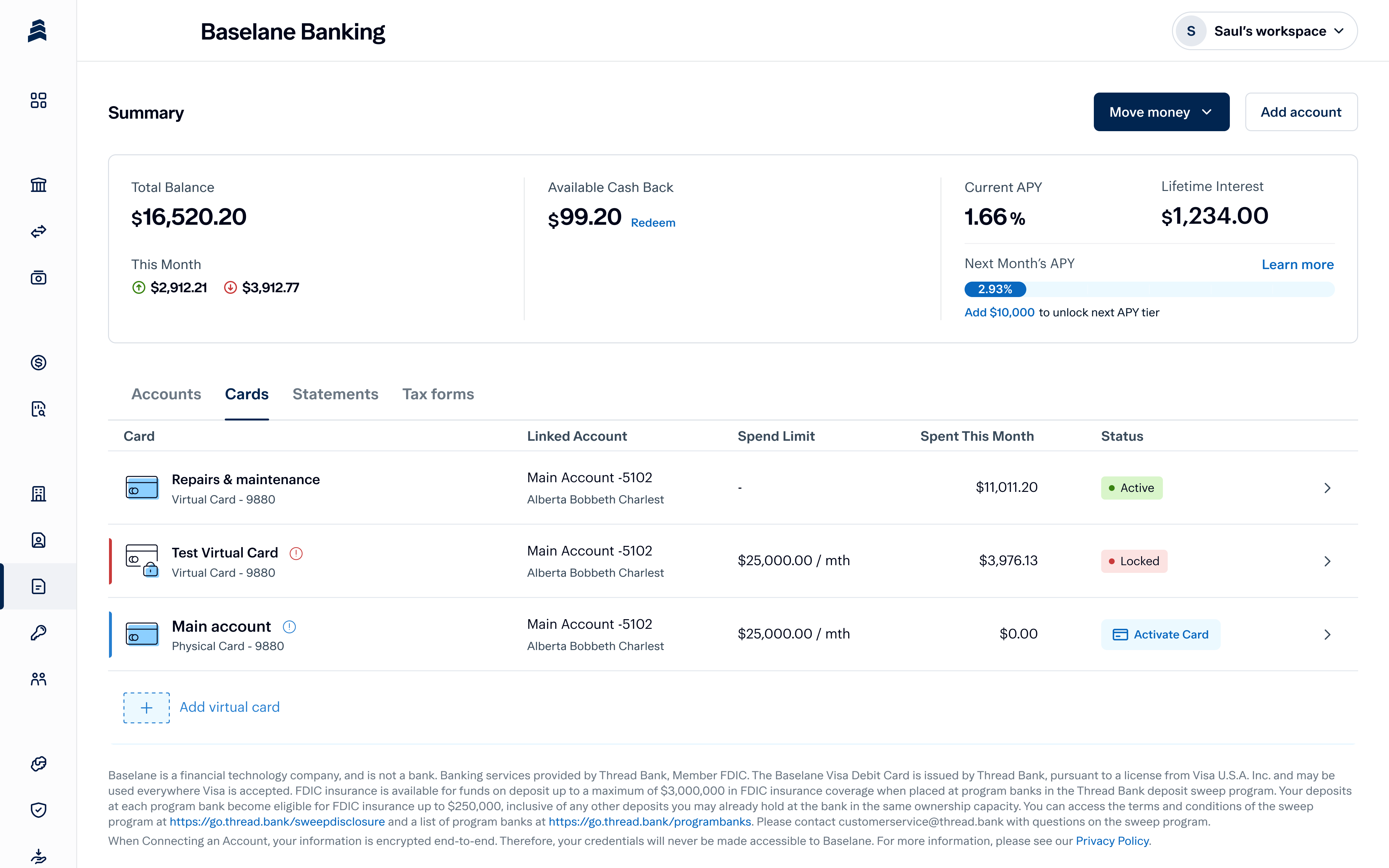- Go to "Cards": Find it under Baselane Banking and click "Create Virtual Card".