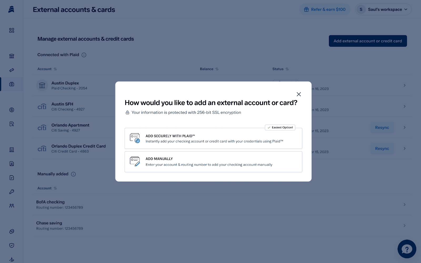- Click "Add External Account": Connect your account securely using Plaid or add it manually.