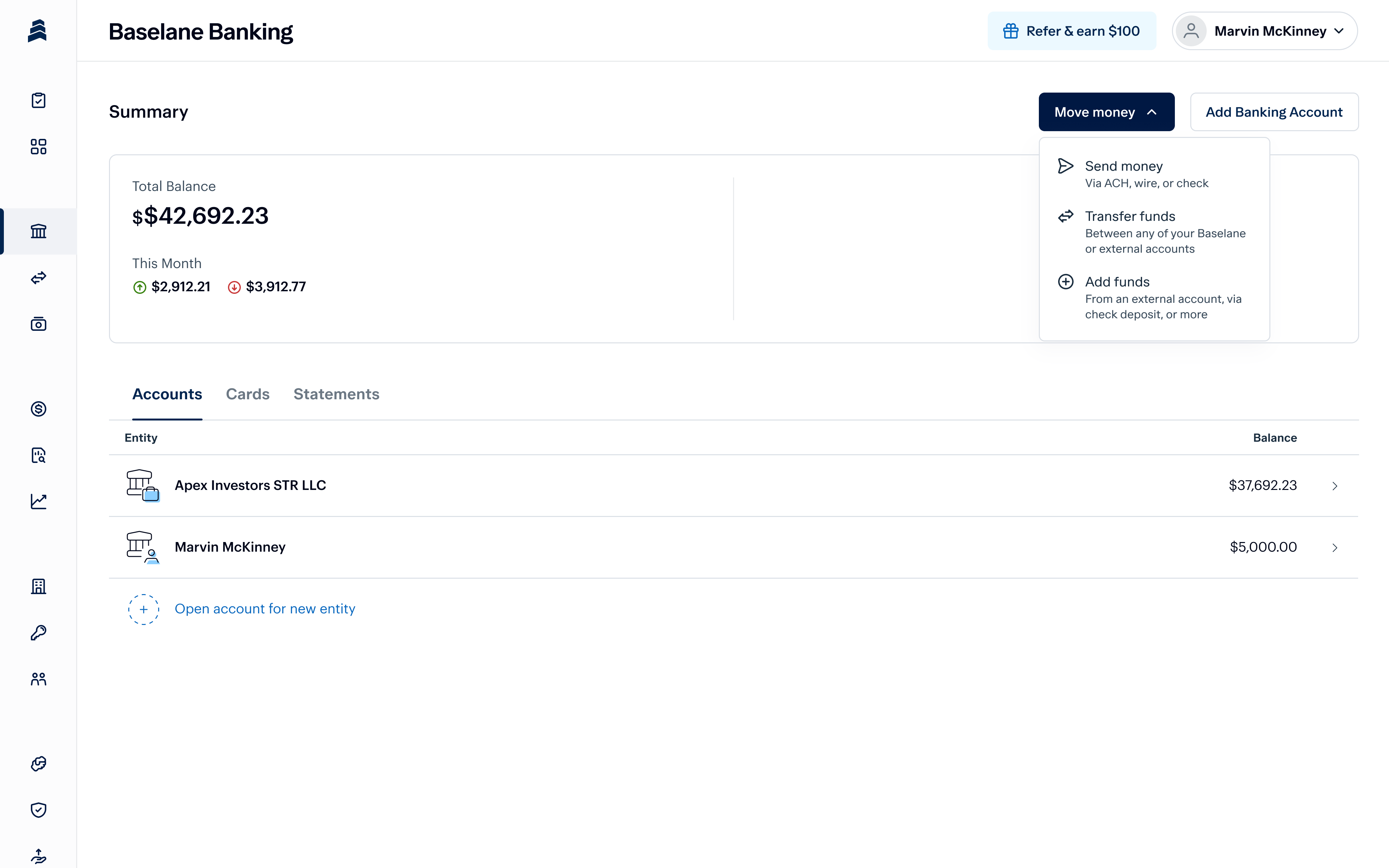 Baselane offers unlimited checking and savings accounts for all your entities and properties under one login that directly connect to vacation rental platforms to receive payouts.