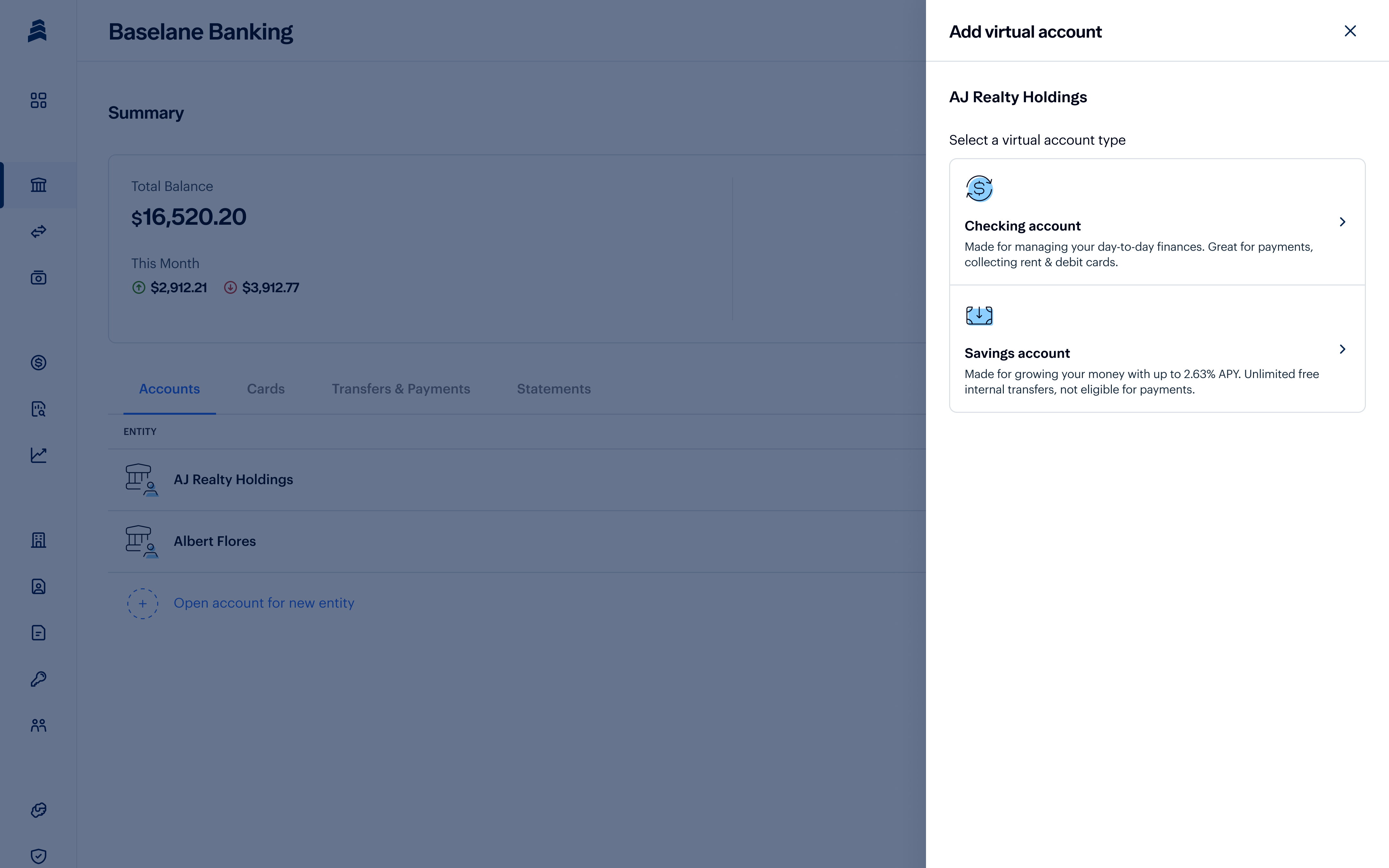 Opening a Baselane banking account for your Airbnb business expenses and income only takes a few minutes. Unlike traditional banks, Baselane lets you open unlimited checking and savings accounts for all your entities and properties — short-term rentals, long-term rentals, and everything in between — under one login. Plus, you can connect vacation rental platforms to receive payments directly into your Baselane account.