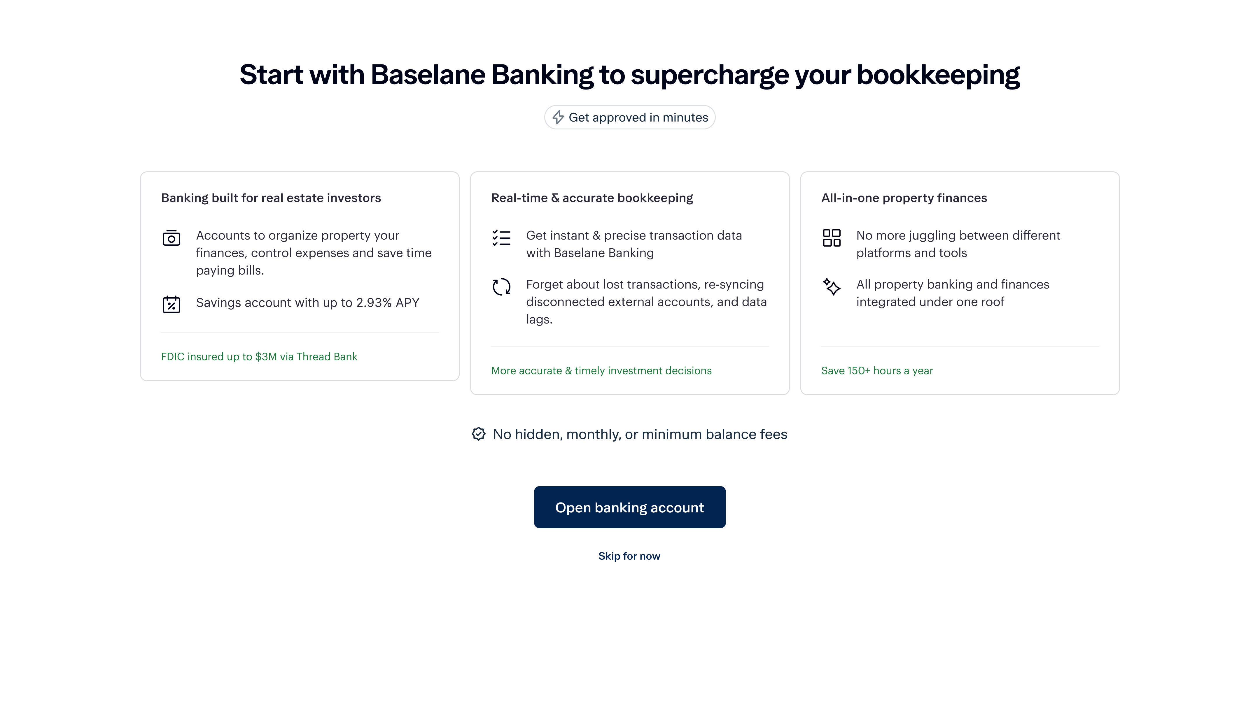 - Baselane banking includes unlimited accounts per property, automated expense tracking and preparing financial reports, online rent collection, plus other key features for real estate investors and landlords all without any monthly fees or minimum balance requirements.