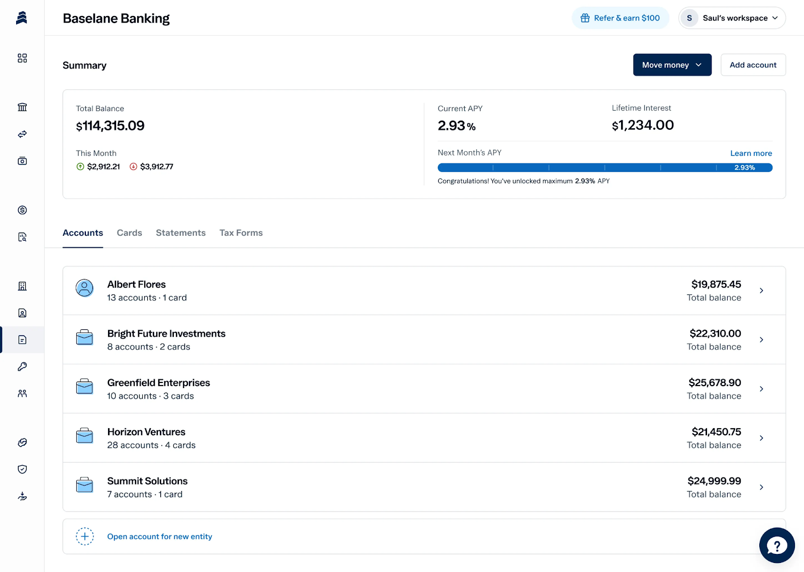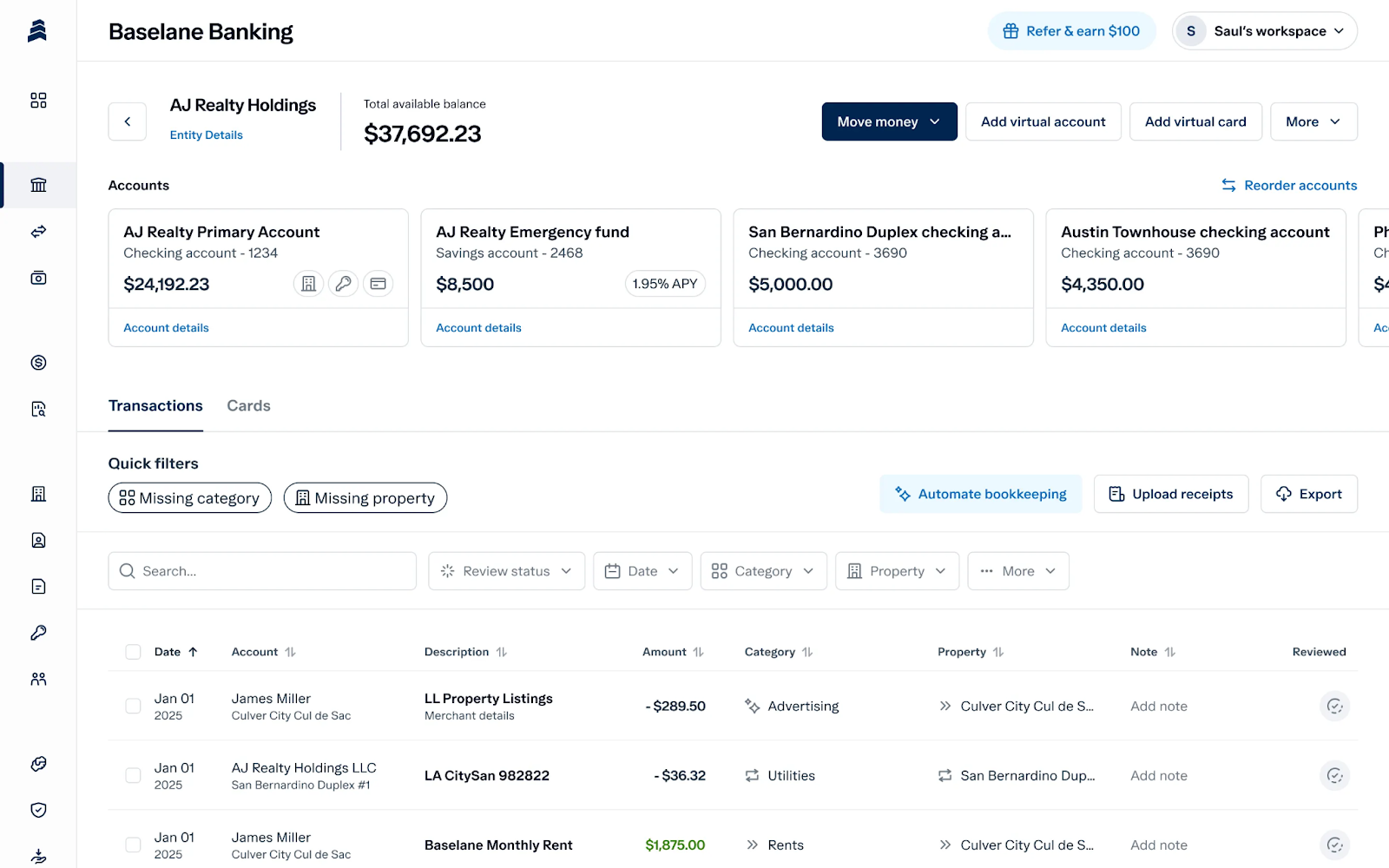 Baselane is a banking platform that helps you open unlimited no-fee checking accounts to separate funds across your properties. Along with checking, you can also open savings accounts for funds like reserves and maintenance.